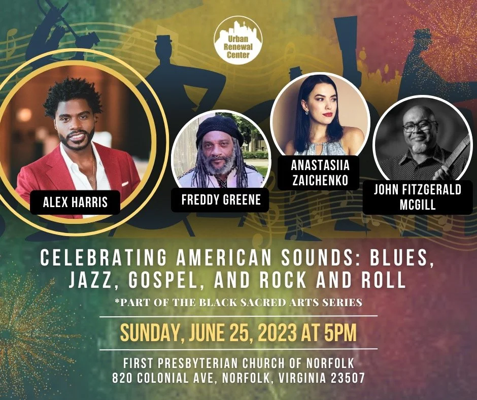 Urban Renewal Center presents: “Celebrating American Sounds” Sunday, June 25, 2023 5:00 PM 7:30 PM First Presbyterian Church 820 Colonial Avenue Norfolk, VA, 23507 United States (map) Google Calendar ICS