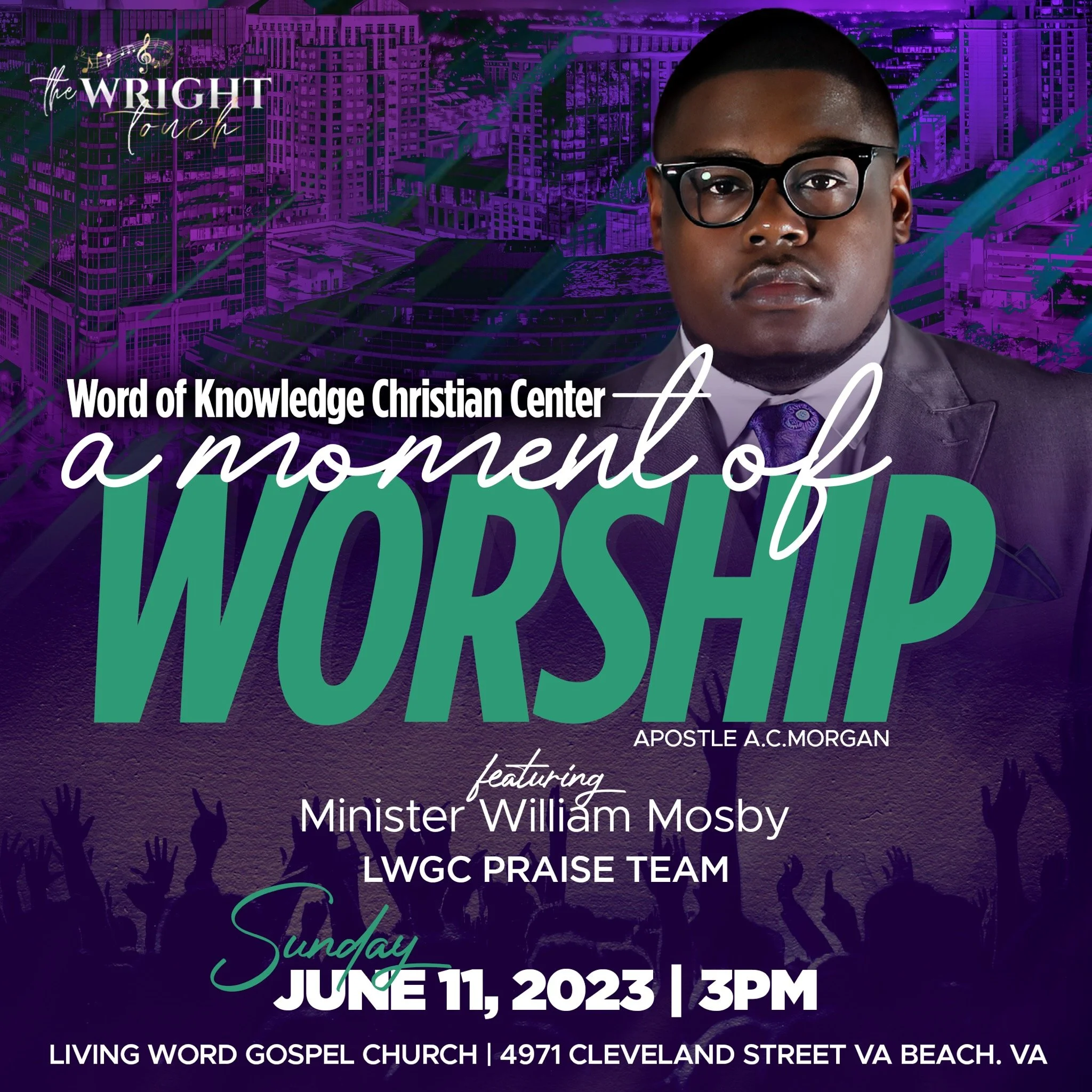Back to All Events A Moment of Worship feat. Min. William Mosby Sunday, June 11, 2023 3:00 PM 5:00 PM Living Word Gospel Church 4971 Cleveland Street Virginia Beach, VA, 23462 United States (map) Google Calendar ICS