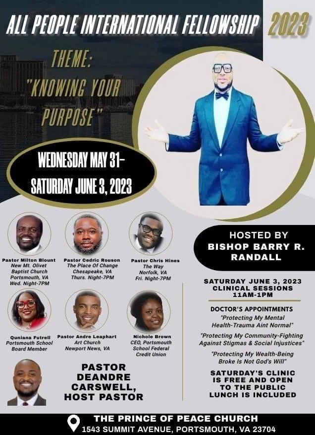 Back to All Events All People International Fellowship 2023 Thursday, June 1, 2023 7:00 PM 9:00 PM The Prince of Peace Church 1543 Summit Avenue Portsmouth, VA, 23704 United States (map) Google Calendar ICS