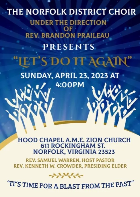 Norfolk District Choir Concert 2023 Sunday, April 23, 2023 4:00 PM 6:00 PM Hood Chapel AME Zion Church 611 Rockingham Street Norfolk, VA, 23523 United States (map) Google Calendar ICS