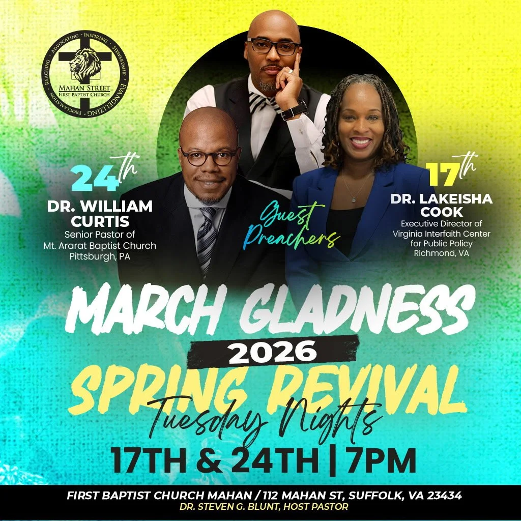 Back to All Events “March Madness” Spring Revival 2026 Tuesday, March 24, 2026 7:00 PM 9:00 PM First Baptist Church Mahan 112 Mahan Street Suffolk, VA, 23434 United States (map) Google Calendar ICS